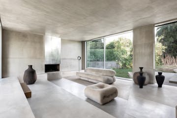The shared family spaces are discreetly positioned beneath ground level, revealed only where the sloping terrain opens along the hillside. Formed in cast raw concrete, these lower levels carry a grounded, brutalist presence, softened by the refined feel of polished surfaces and the comfort provided by underfloor and wall heating.