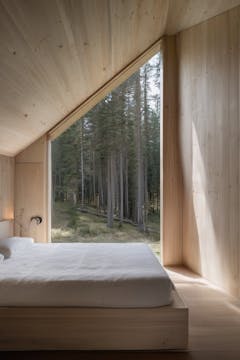 Above, the private rooms rise as a slender tower among century-old pine trees. Built from lightweight, prefabricated CLT panels assembled on site, the upper volumes sit quietly within the landscape. The result is a home that balances rugged materiality with refined warmth, shaped by both the mountain’s character and the needs of contemporary family life.